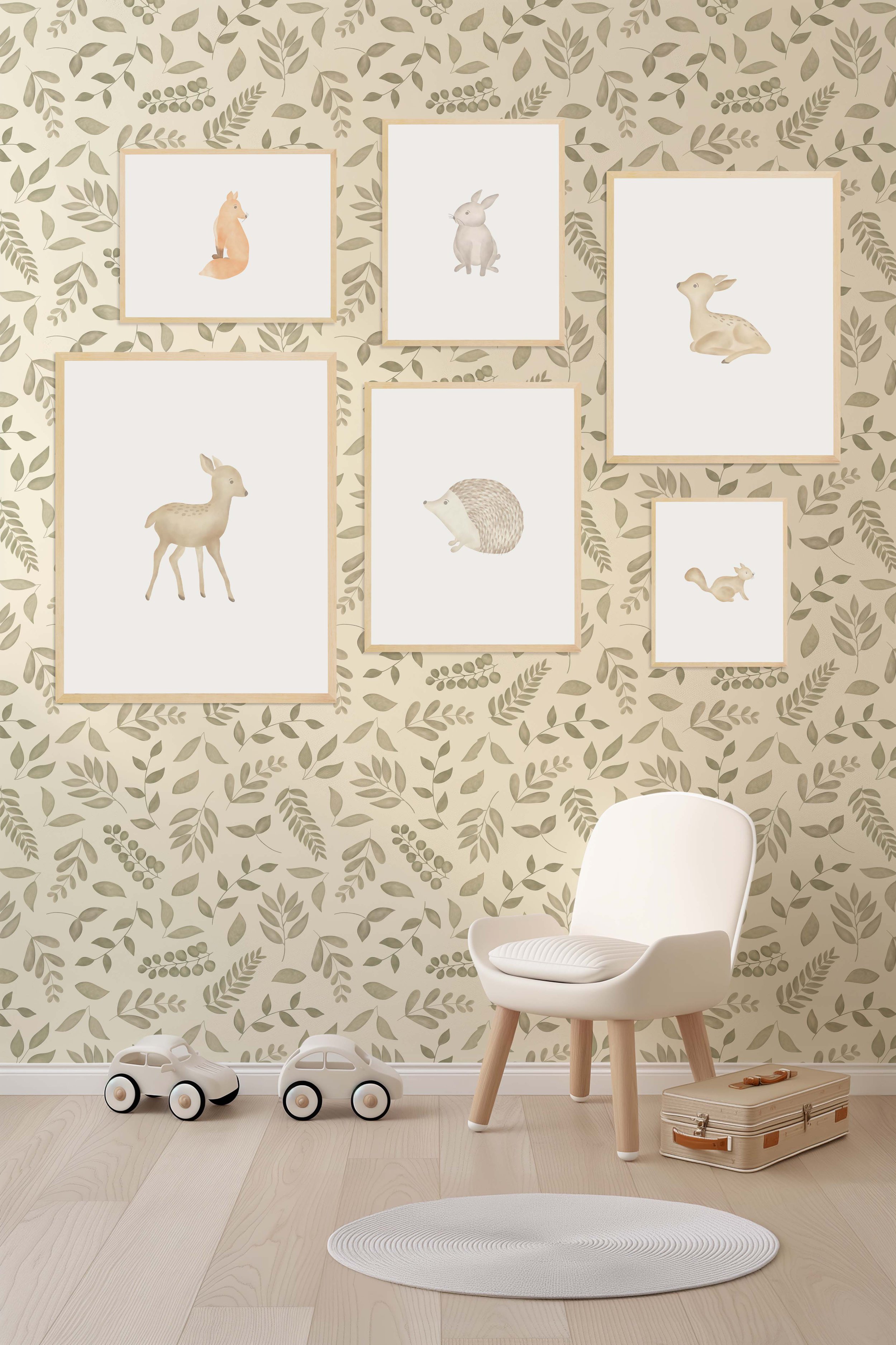 Soft, calming botanical leaves — ideal for an airy, neutral woodland look. Perfect for: gender-neutral nurseries, minimalist homes.
